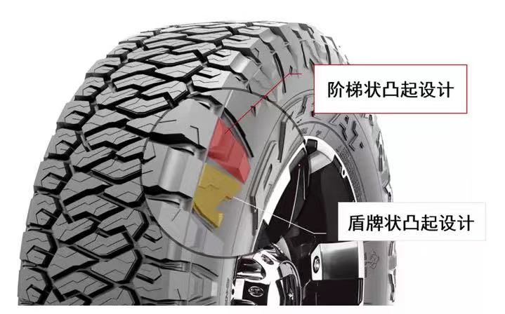 胎側采用階梯狀凸起和盾牌狀凸起設計,有效保護胎側,提高輪胎耐久性。